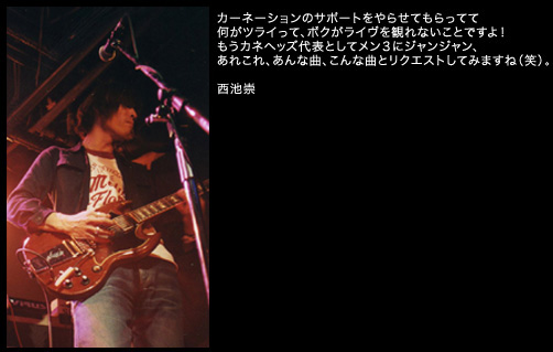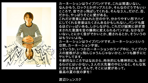 Hurricane Merchandise 2007 Tour Goods カーネーション 東名阪ツアー2007 "夏の夜の夢" メンバーからのコメント到着! 久しぶりにツアーに出ます。 --------------------------------------------------------------------------------------- 暑い夏も終わった?と思ったらカーネーション台風が襲来するから要注意! --------------------------------------------------------------------------------------- ライブでは(たぶん)初披露のレア曲あるよ。是非おいでやす〜。 --------------------------------------------------------------------------------------- 西池崇(guitar)、渡辺シュンスケ(key)サポート決定! ![]() ![]()