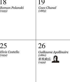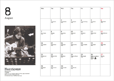 カレンダー 会場限定! 1年365日、すべての日付にカーネーションが尊敬してやまない音楽家、作家、詩人、俳優などアーティストたちのお誕生日をプリント*1した手のこんだ逸品。毎月満載のレア・フォト*2は、ここ数年のカーネーションを撮り続けてくれている石田昌隆さんによる蔵出しショッツ! |